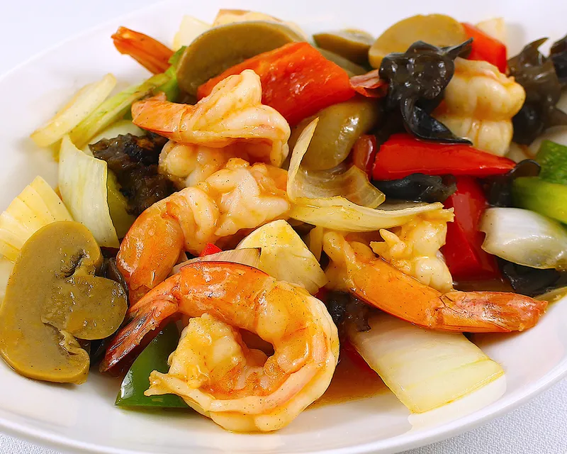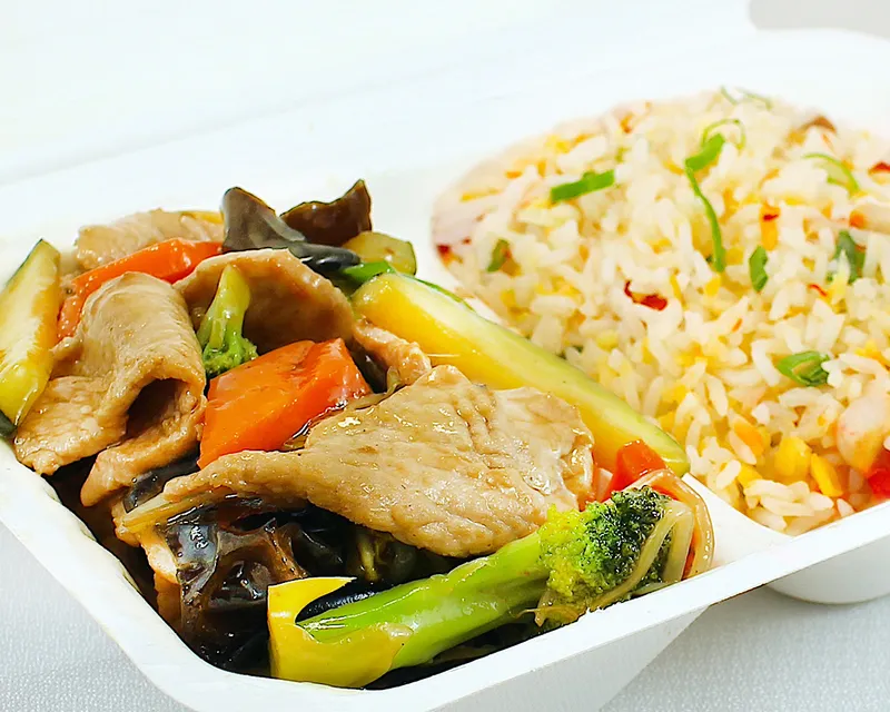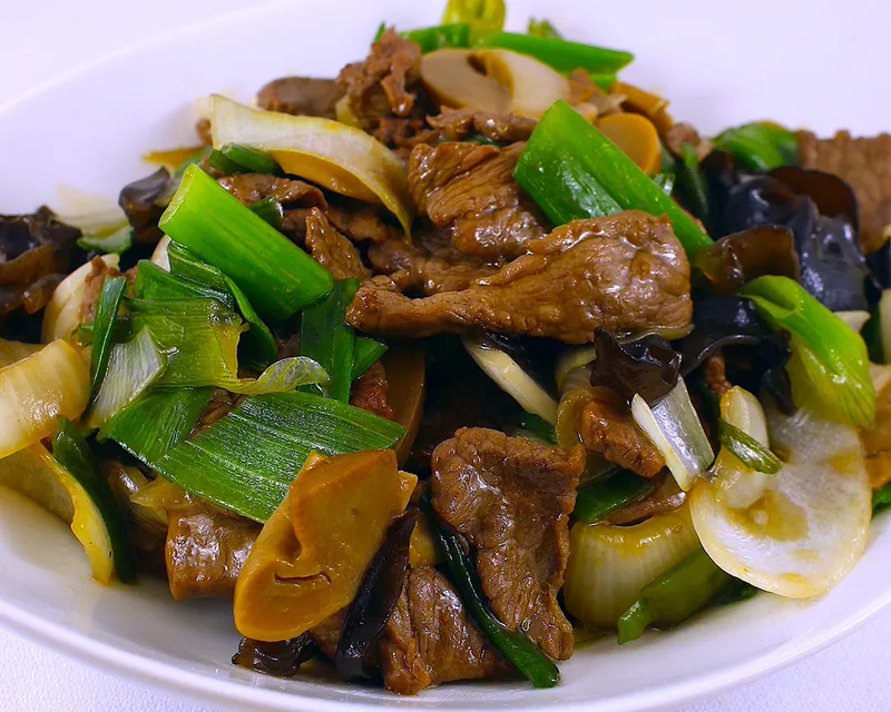 Mix de verduras y carne salteado con diente de dragón, algas, cebollín, y salsa de soja.